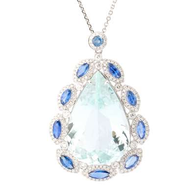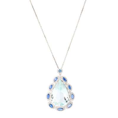 Claw-set with a mixed-cut pear-shaped aquamarine, in a border of round brilliant-cut diamonds and marquise-cut sapphires, trace-link chain, stamped Pt950