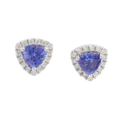 Each collet-set with a trilliant-cut Tanzanite in a border of small round brilliant-cut diamonds, post and butterfly fittings, stamped Au750