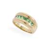 Channel-set with eight square step-cut emeralds, one shoulder gypsy-set with a small round brilliant-cut diamond, stamped 14k