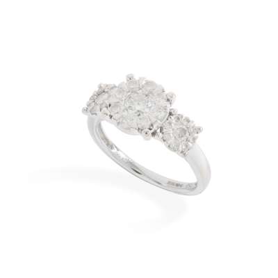 Claw-set with three clusters of round brilliant-cut diamonds, plain band, UK hallmark
