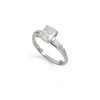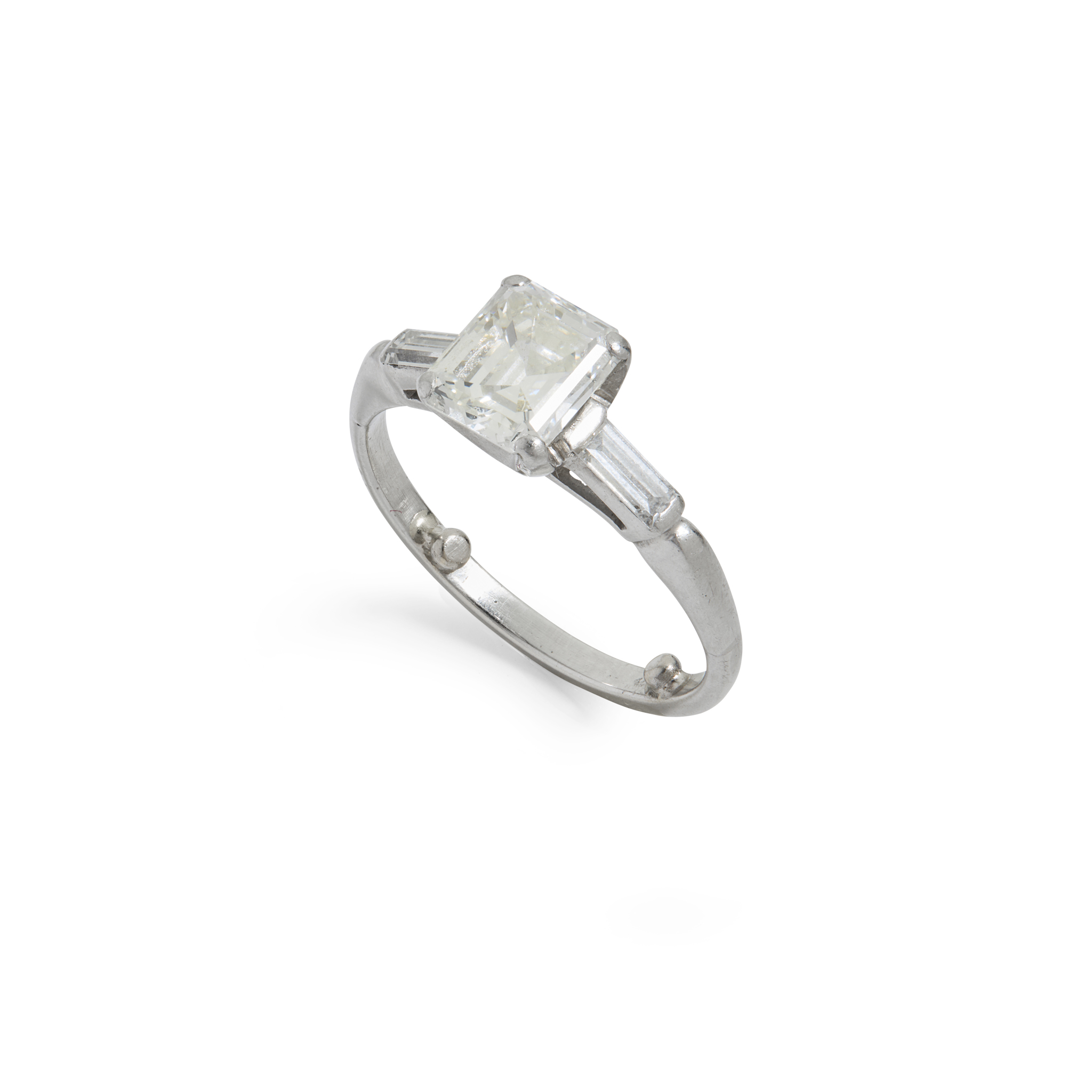 Claw-set with a rectangular step-cut diamond, weighing approximately 1.25cts, each shoulder set with a baguette-cut diamond, plain band, unmarked