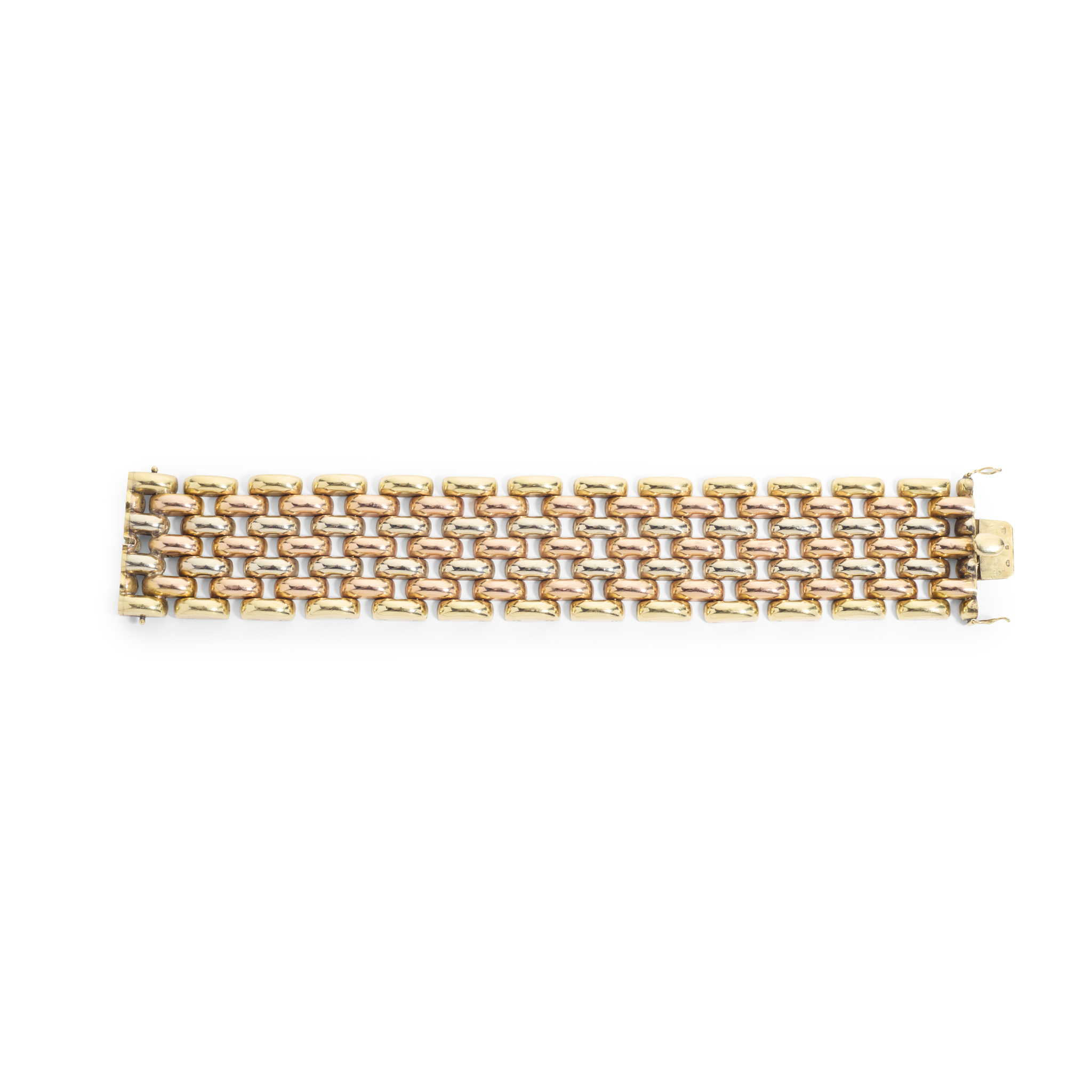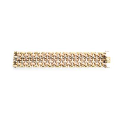 Of broad design, composed of polished yellow and rose-coloured links, with Hungarian control marks for 14k gold