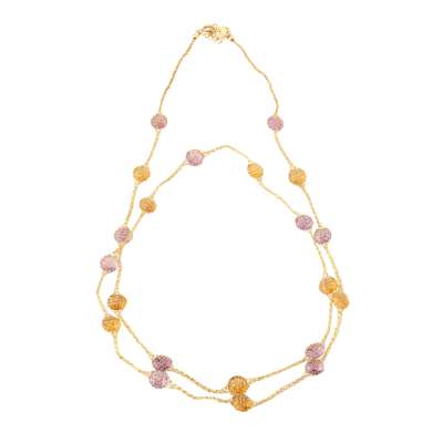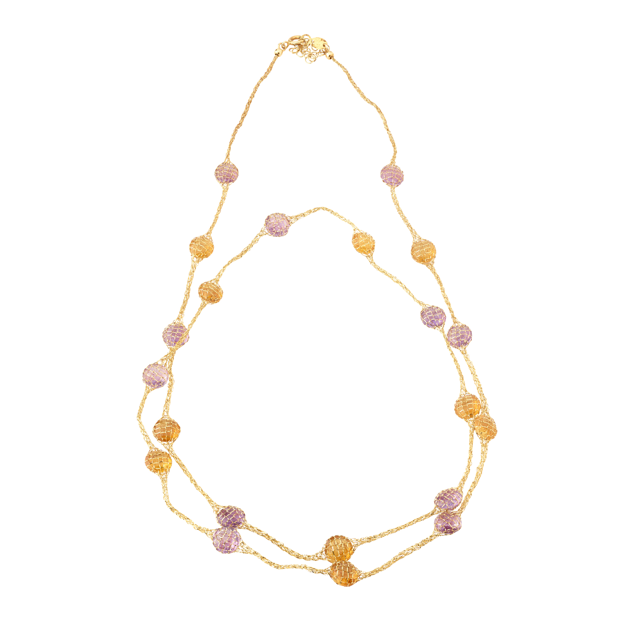 Composed of alternating enmeshed round-cut amethysts and citrines, stamped 18K
