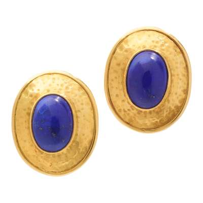 Each collet-set with an oval cabochon lapis lazuli in a border with hammered finish, post and clip fittings, UK hallmark