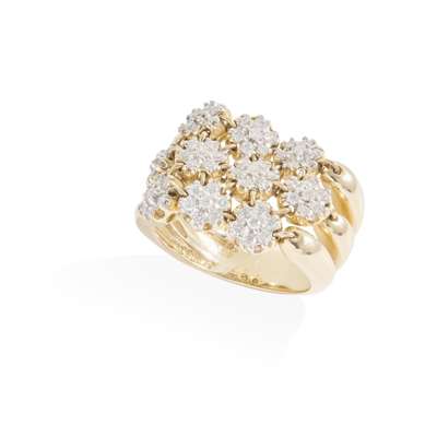 Composed of ten articulated round brilliant-cut diamond clusters, ribbed detail to shoulders, stamped 14K SONIA B