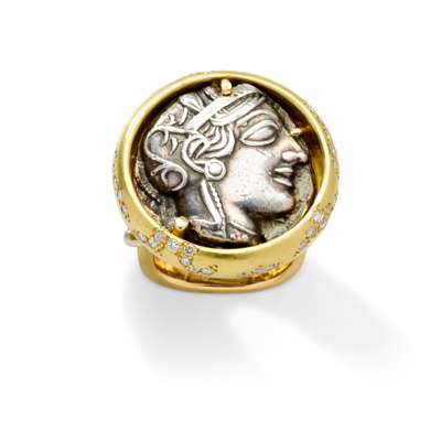 Set with an Athenian Tetradrachm (5th century BC), the mount pavé-set with graduated round brilliant-cut diamonds, stamped 750, with makers monogram