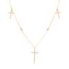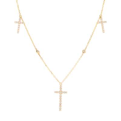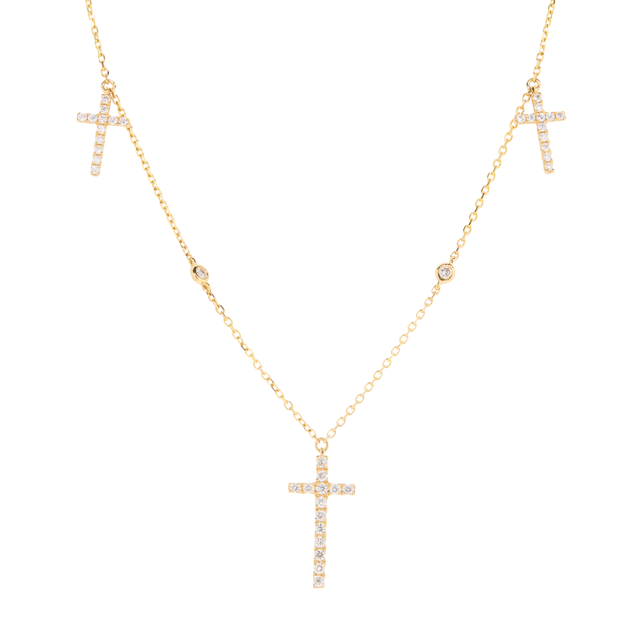 The trace-link chain suspending three Latin crosses set with round brilliant-cut diamonds, spectacle-set diamond detail to chain, stamped Au750