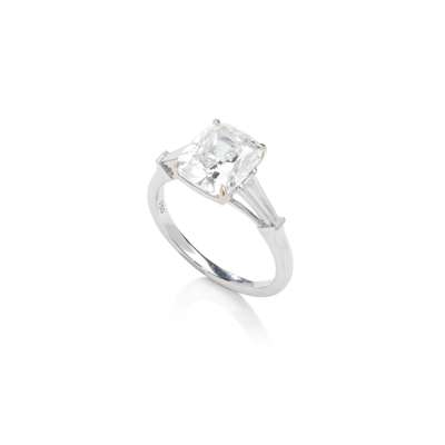 Claw-set with a cushion-cut diamond, weighing 4.02cts, each shoulder set with a tapered baguette-cut, plain band, stamped 750