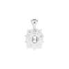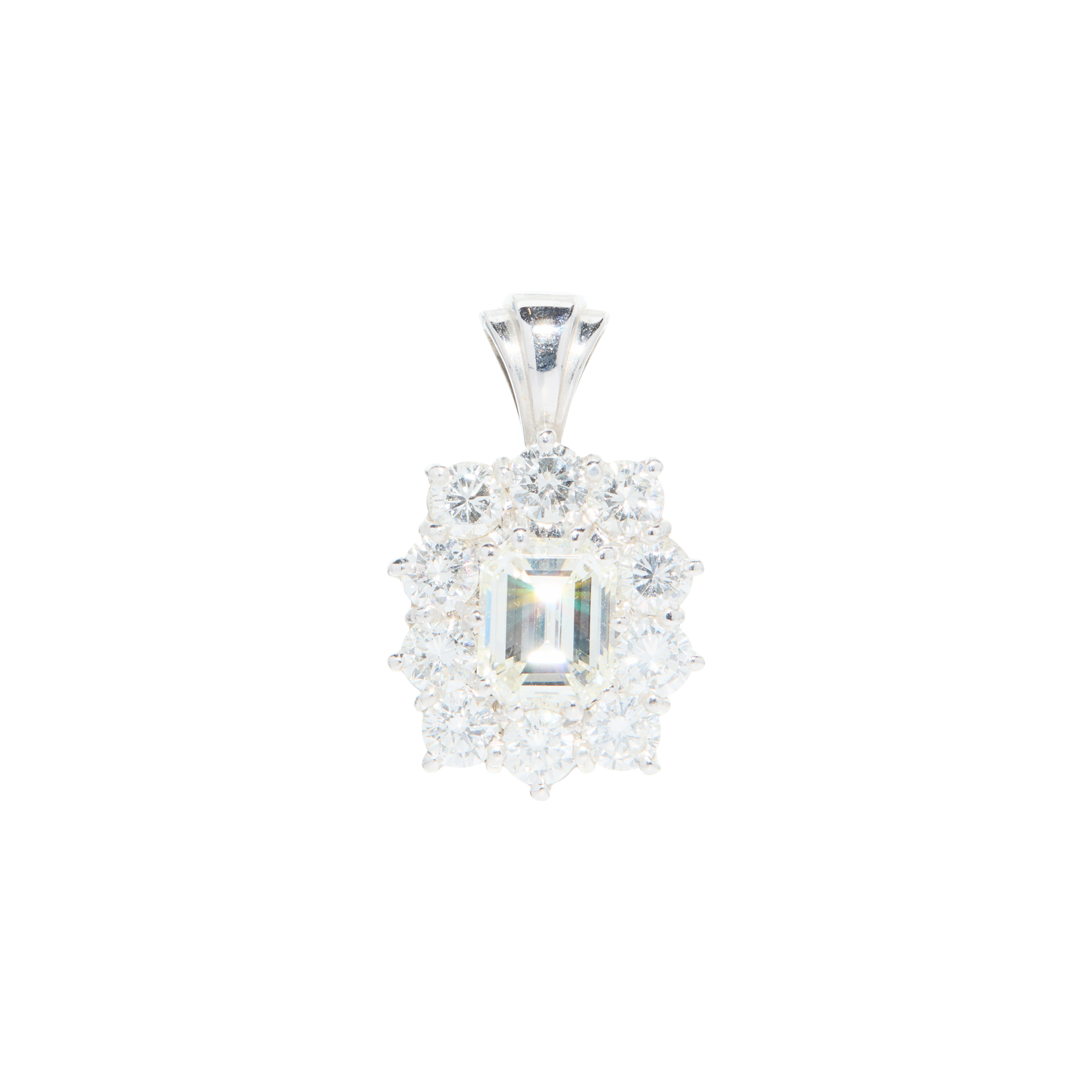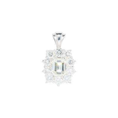 Claw-set with a cut-cornered rectangular-cut diamond, weighing approximately 1.65cts, in a border of round brilliant-cut diamonds, stamped 14k