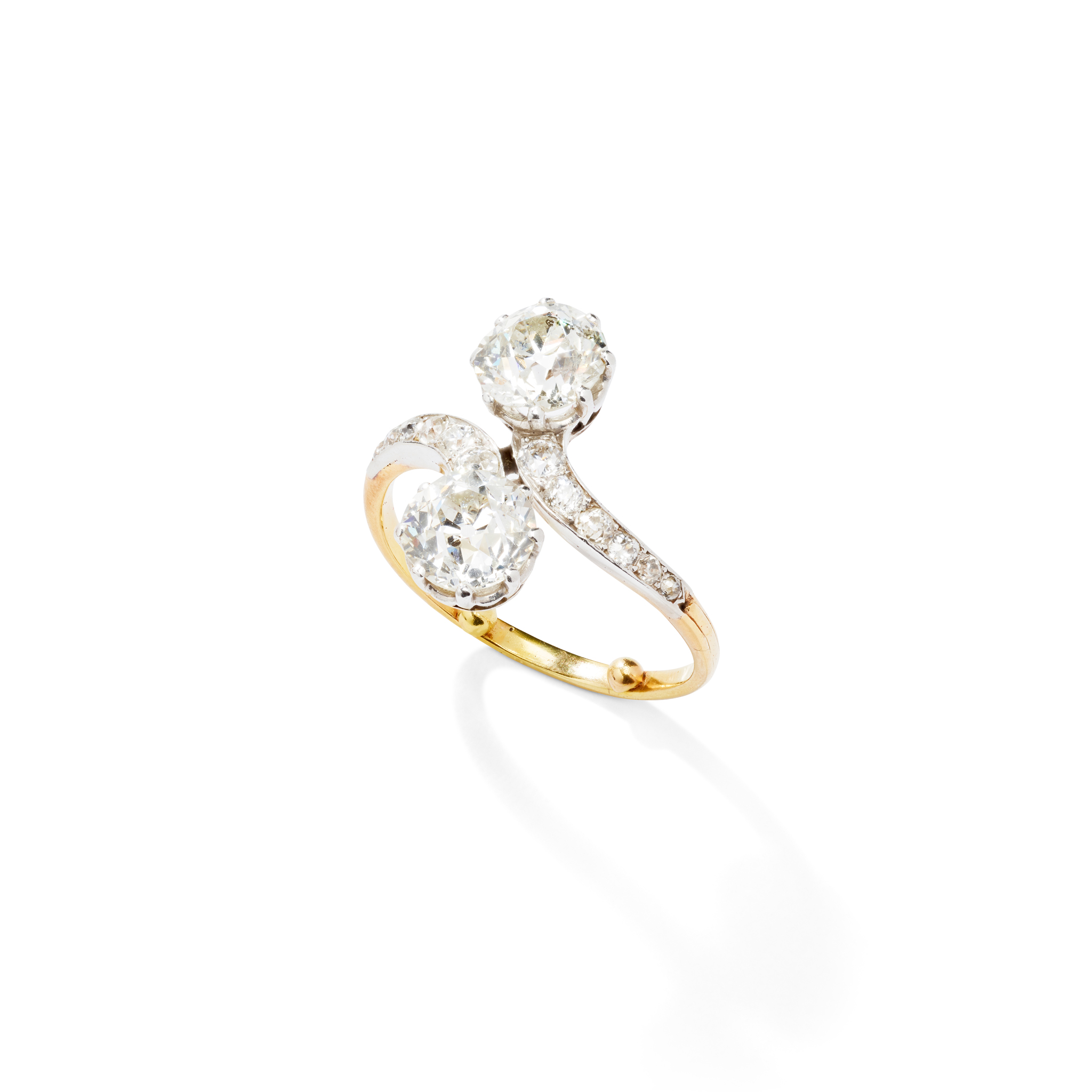 Claw-set with two old round-cut diamonds, weighing approximately 1.35cts and 1.20cts, the curved shoulders set with old round-cut diamonds, plain band, unmarked