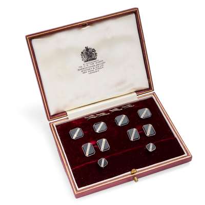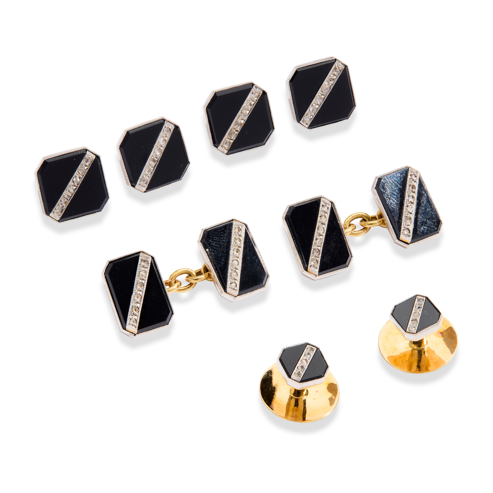 Comprising four buttons, two studs and a pair of cufflinks, each rectangular/square onyx terminal with applied diagonal line of rose-cut diamonds, stamped 18c & Pt; in a fitted case for Asprey & Co … London