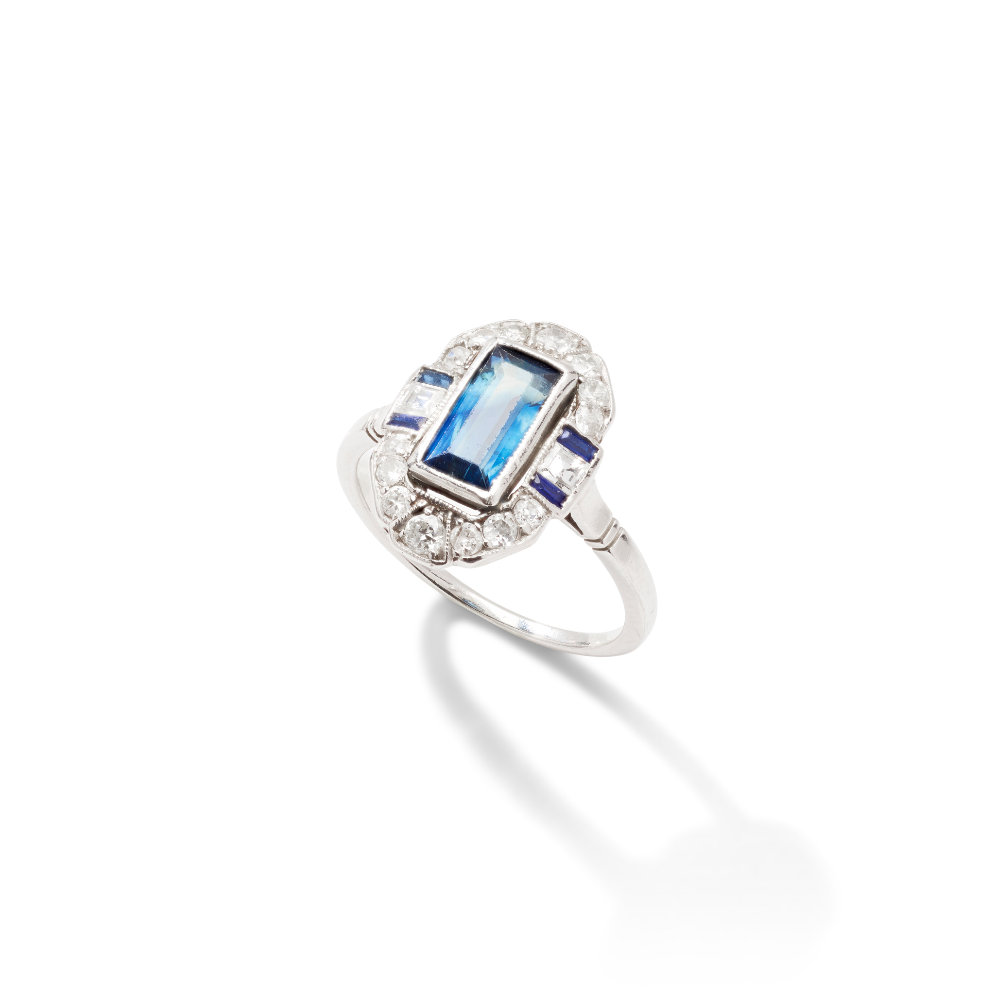 Collet-set with a rectangular step-cut sapphire, in a border of old round and square step-cut diamonds and baguette-cut sapphires, plain band, unmarked