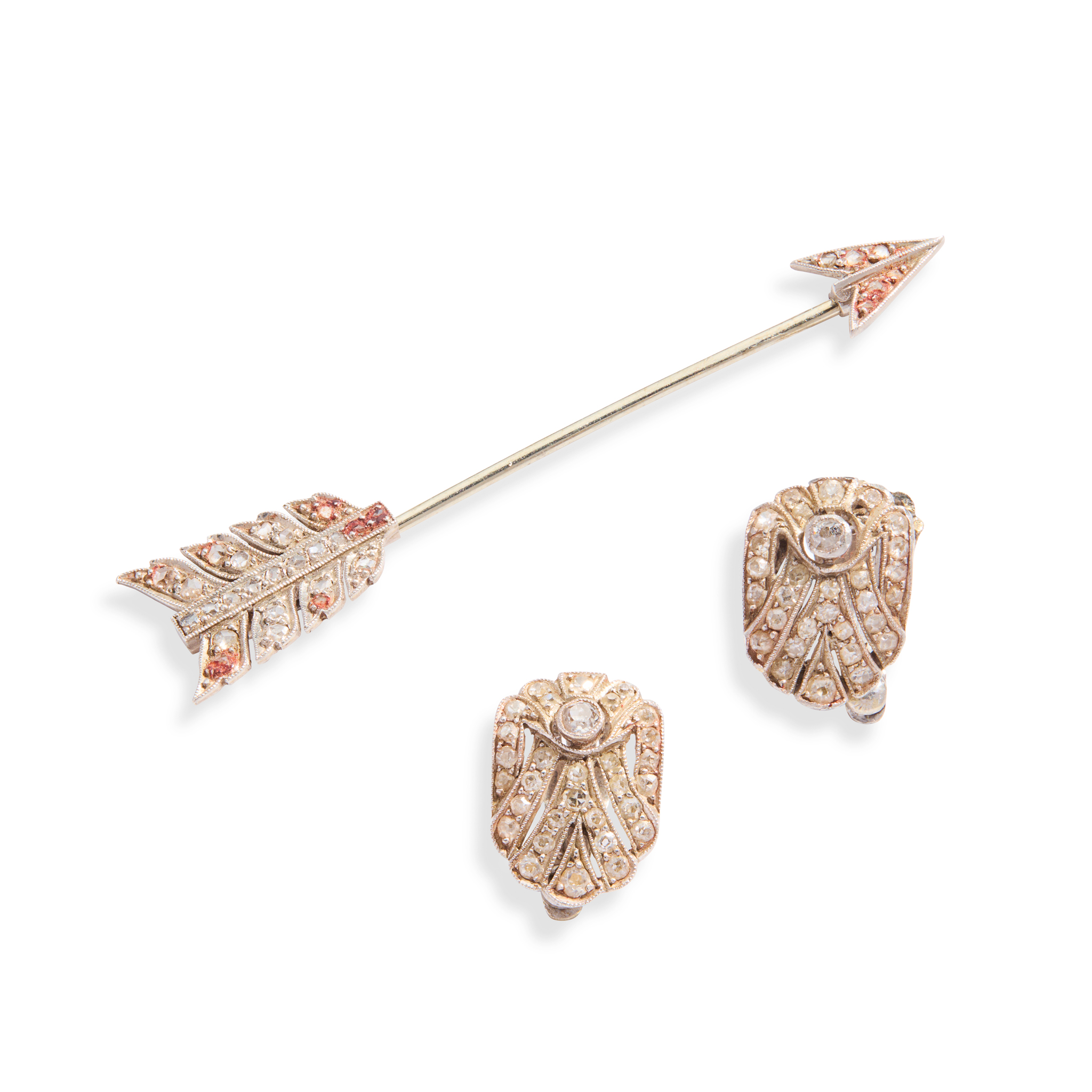 Modelled as an arrow and set with rose-cut diamonds, stamped PLAT 18CT; together with a pair of rose-cut diamond lapel clips, unmarked (2)