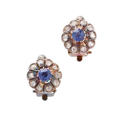 Each claw-set with a round-cut synthetic sapphire in a rose-cut diamond surround, clip fittings, unmarked