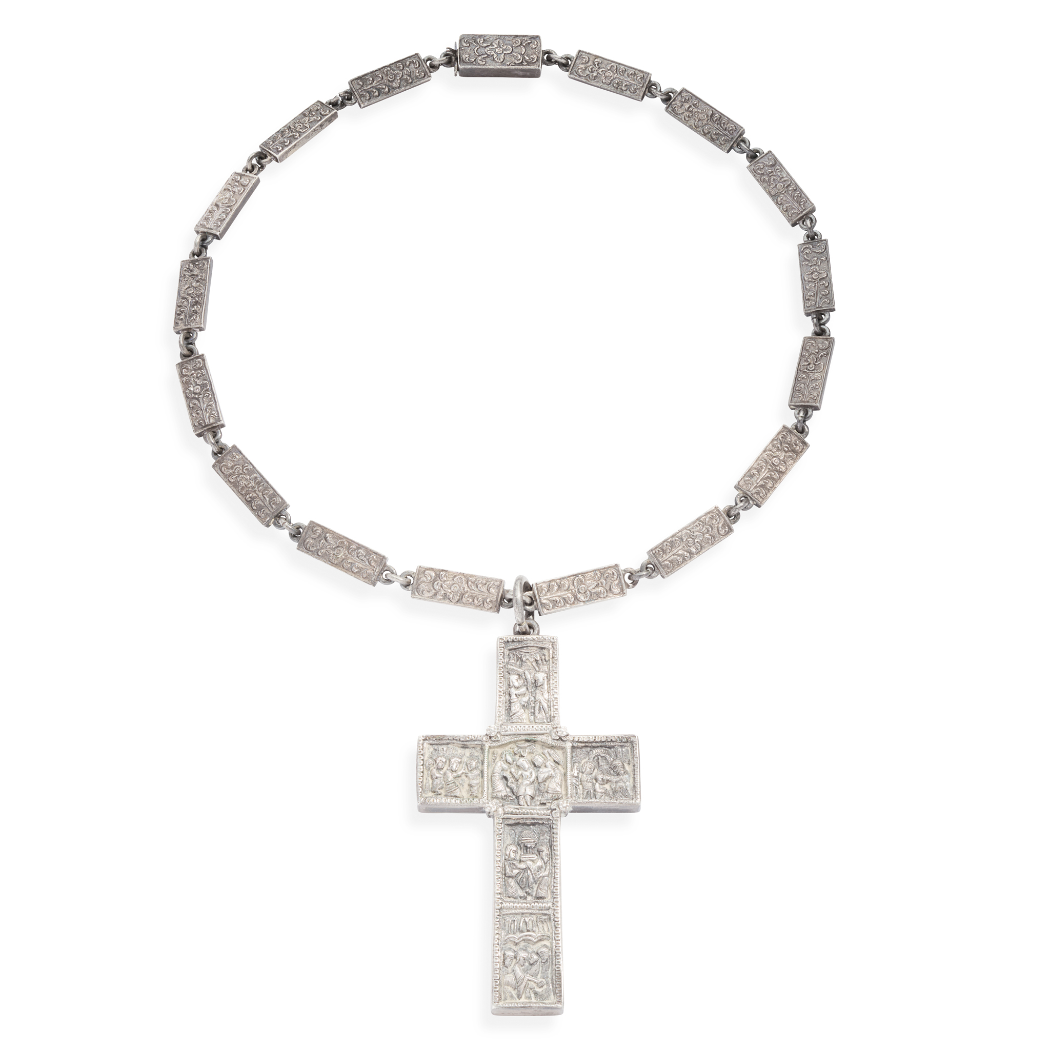 The necklace composed of rectangular panels with floral detail, the hollow cross with cast allegorical detail, unmarked