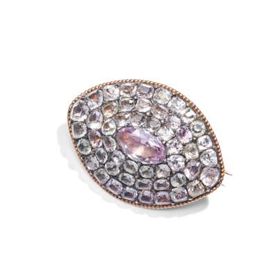 Of navette outline, set with various pink and colourless pastes in a closed back setting, unmarked