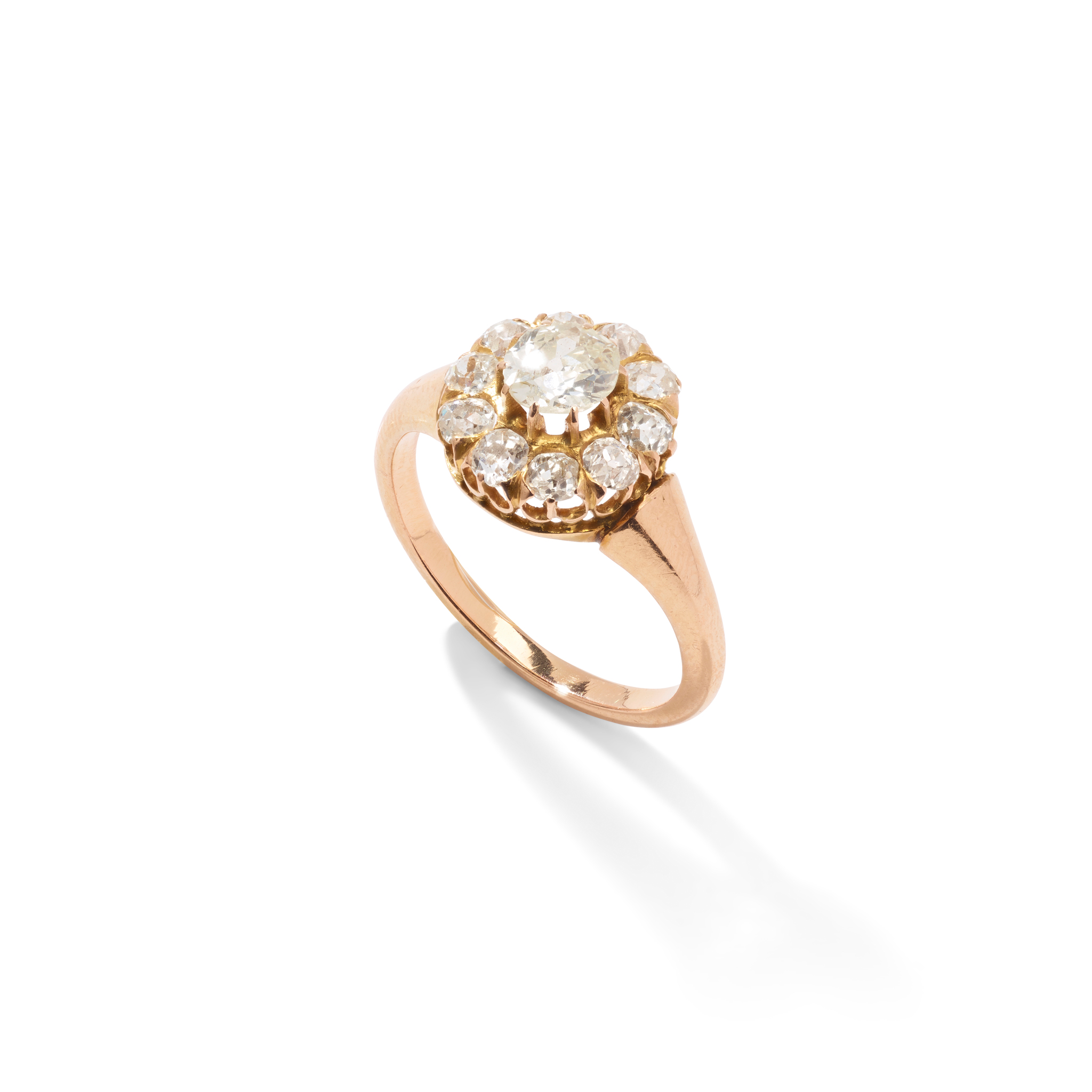 Claw-set with an old round-cut diamond, in a border of old round and cushion-cut diamonds, plain band, unmarked