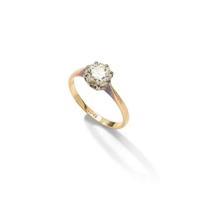 Claw-set with an old round-cut diamond, weighing approximately 0.99cts, plain band, stamped 18ct