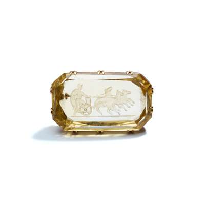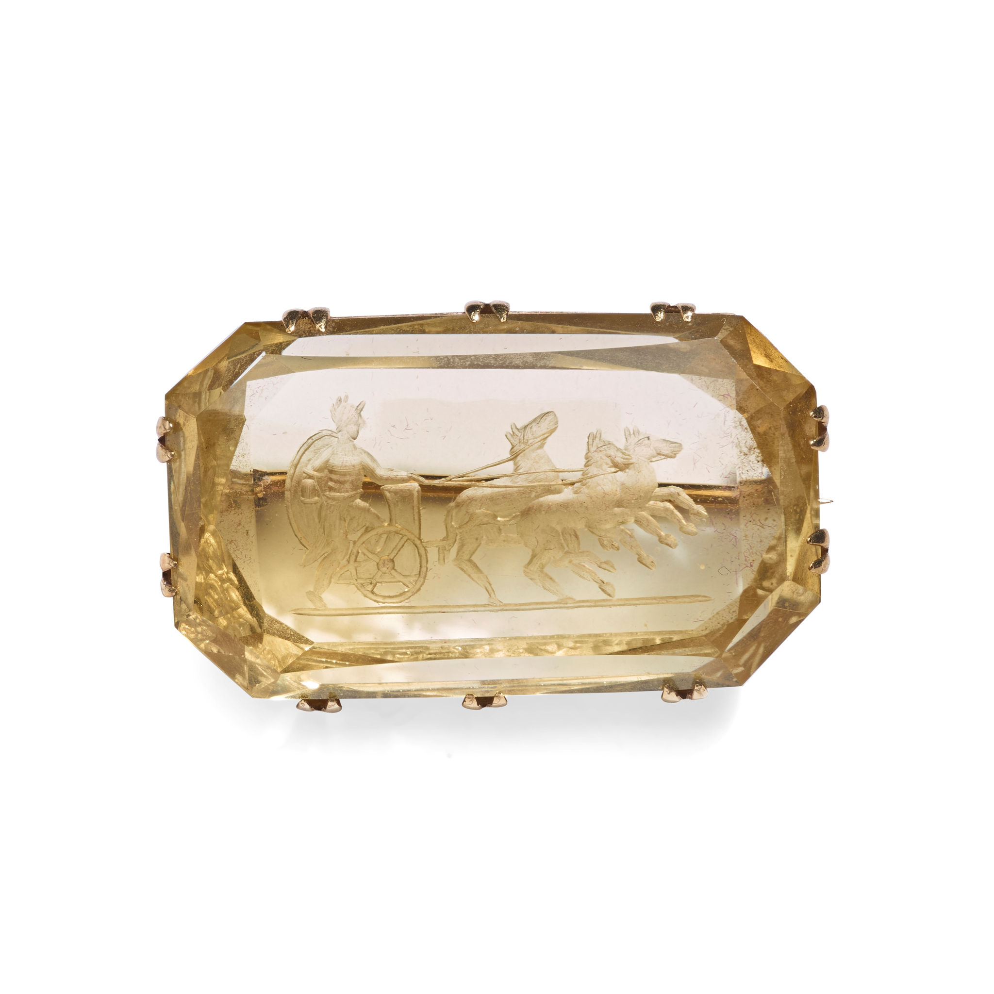 The rectangular mixed-cut citrine with intaglio detail of an ancient Greek warrior and chariot, unmarked