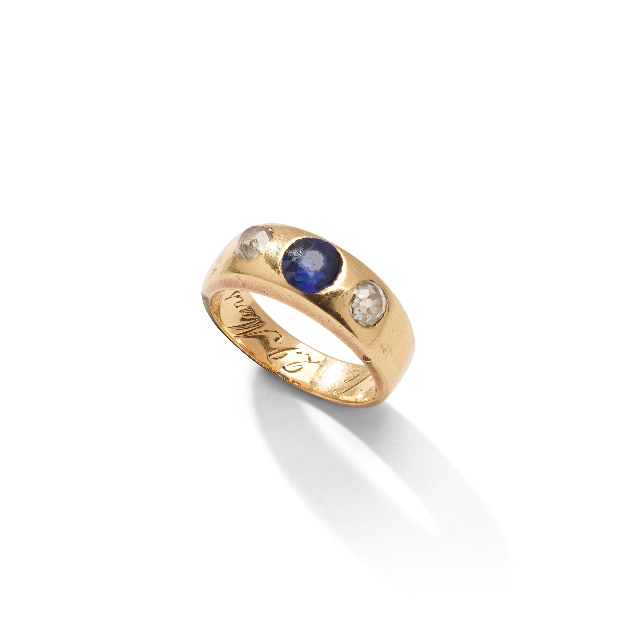 Gypsy-set with a round-cut sapphire and two old round-cut diamonds, plain band, unmarked