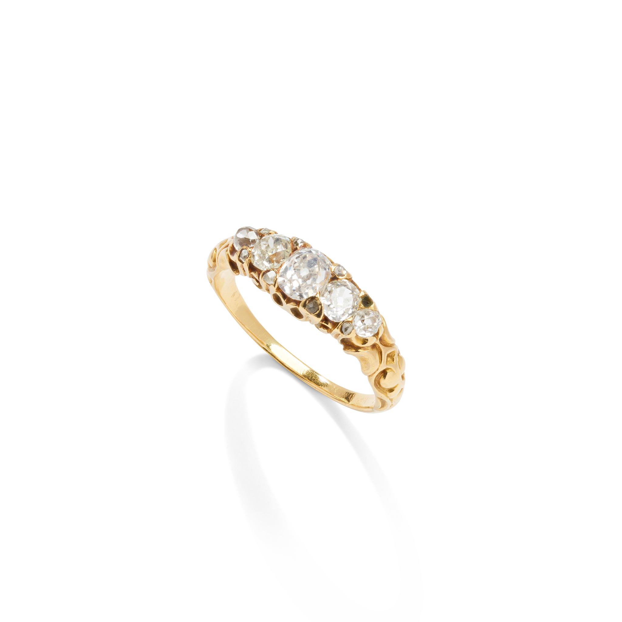 Claw-set with five graduated old round-cut diamonds, rose-cut diamond accents (one deficient), scrolling detail to shoulders, unmarked