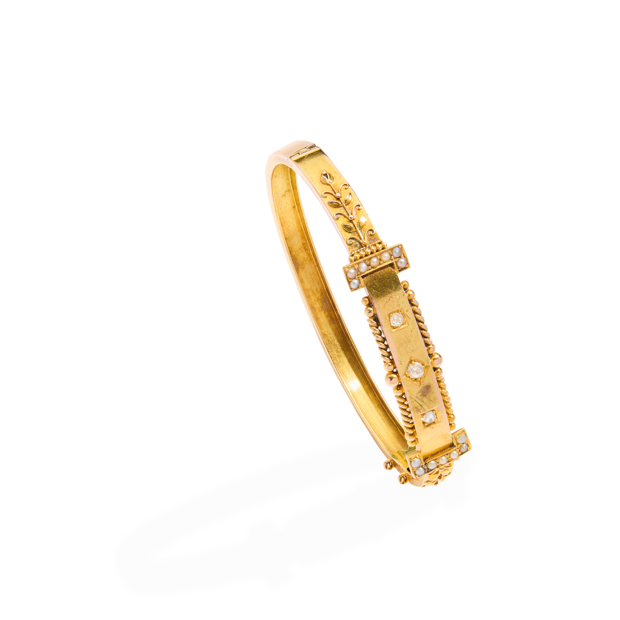Of hinged design, centrally-set with three old round-cut diamonds, bordered on either side by half-cut seed pearls, floral detailing, unmarked
