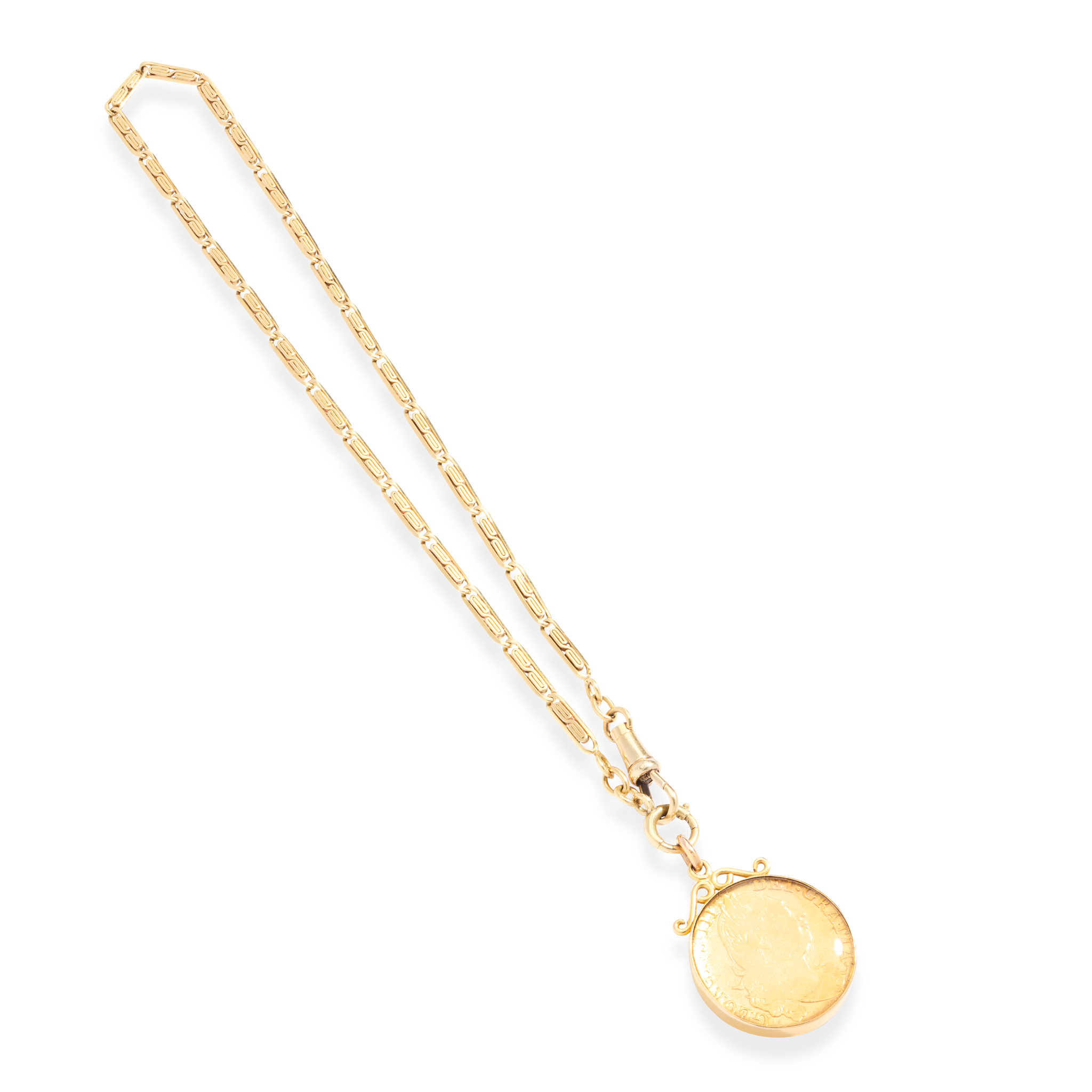 Composed of elongated decorative links, indistinct marks to clasp, suspending a glazed guinea pendant