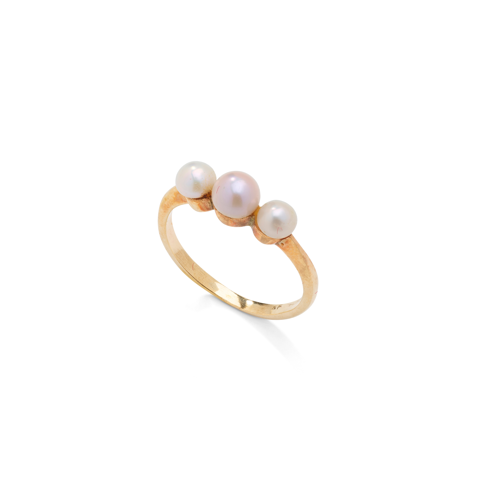 Set with three graduated bouton pearls, plain band, UK hallmark; in original box signed Cairncross … Perth