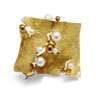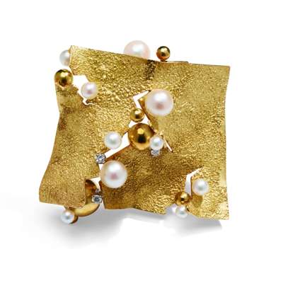 Of stylised square outline, the textured ground set at intervals with graduated cultured pearls and round brilliant-cut diamonds, stamped 18K