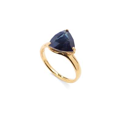 Claw-set with a trilliant-cut sapphire, plain band, stamped 750