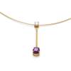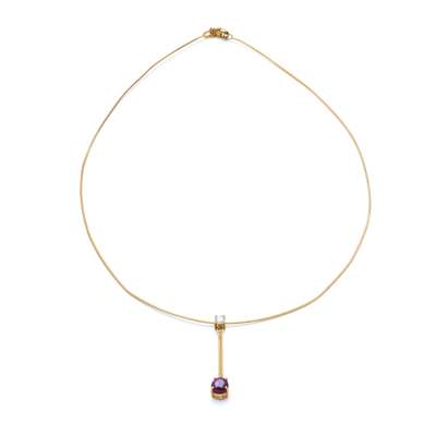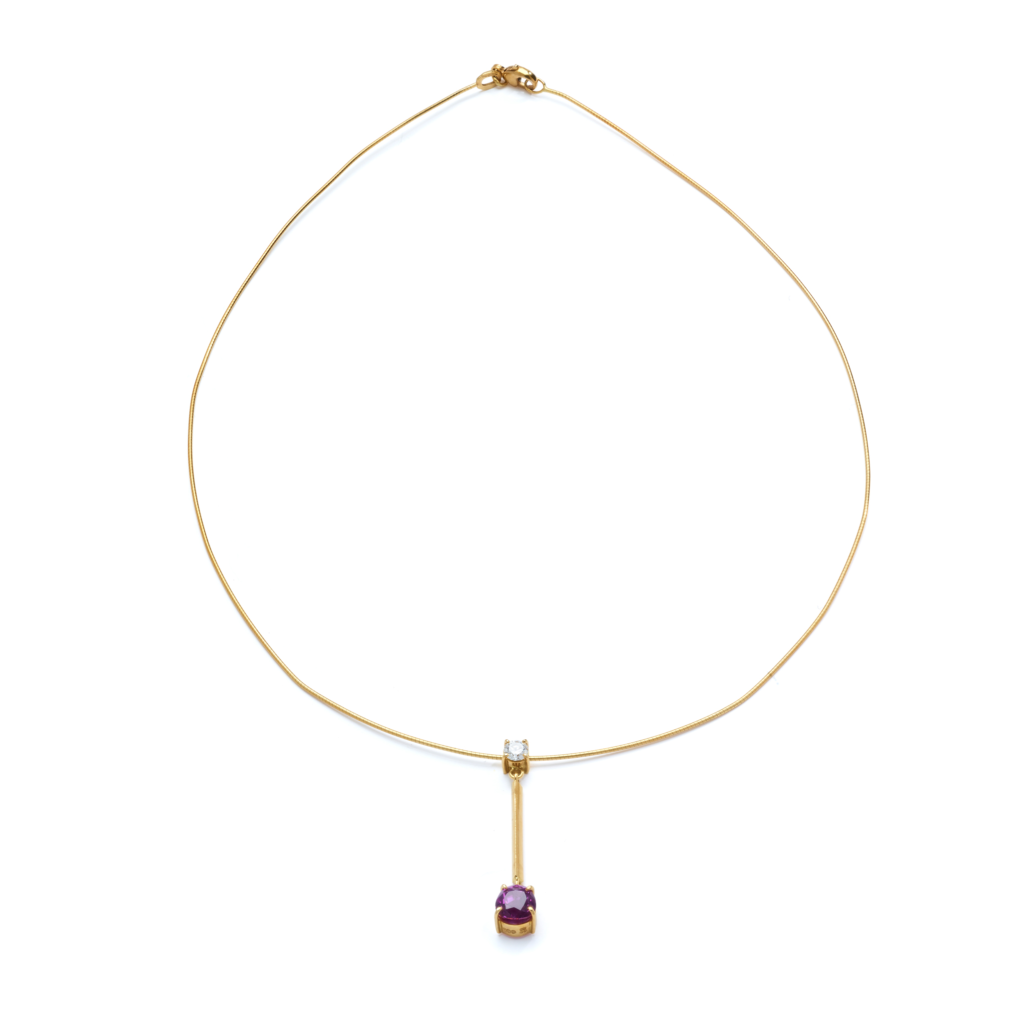 Claw-set with a round brilliant-cut diamond, suspending a cushion-cut ruby from a knife bar link, snake-link chain, UK hallmark
