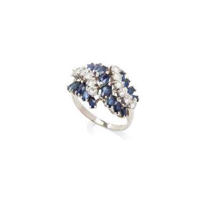 Claw-set with alternating rows of marquise-cut sapphires and round brilliant-cut diamonds, plain band, unmarked