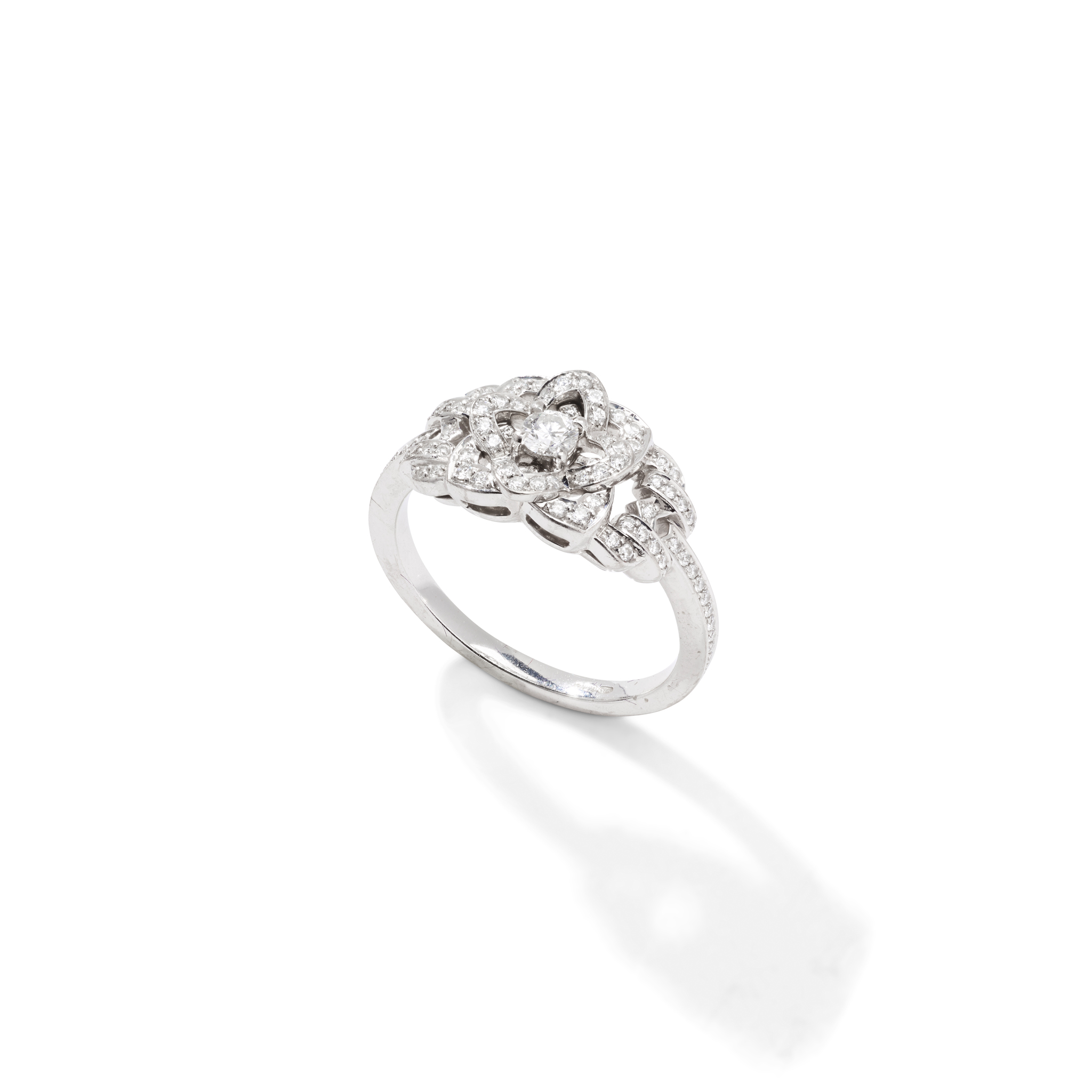 Claw-set with a round brilliant-cut diamond, in a floral pavé-set diamond border, additional diamond detailing to shoulders, UK hallmark; with original box and outer-box