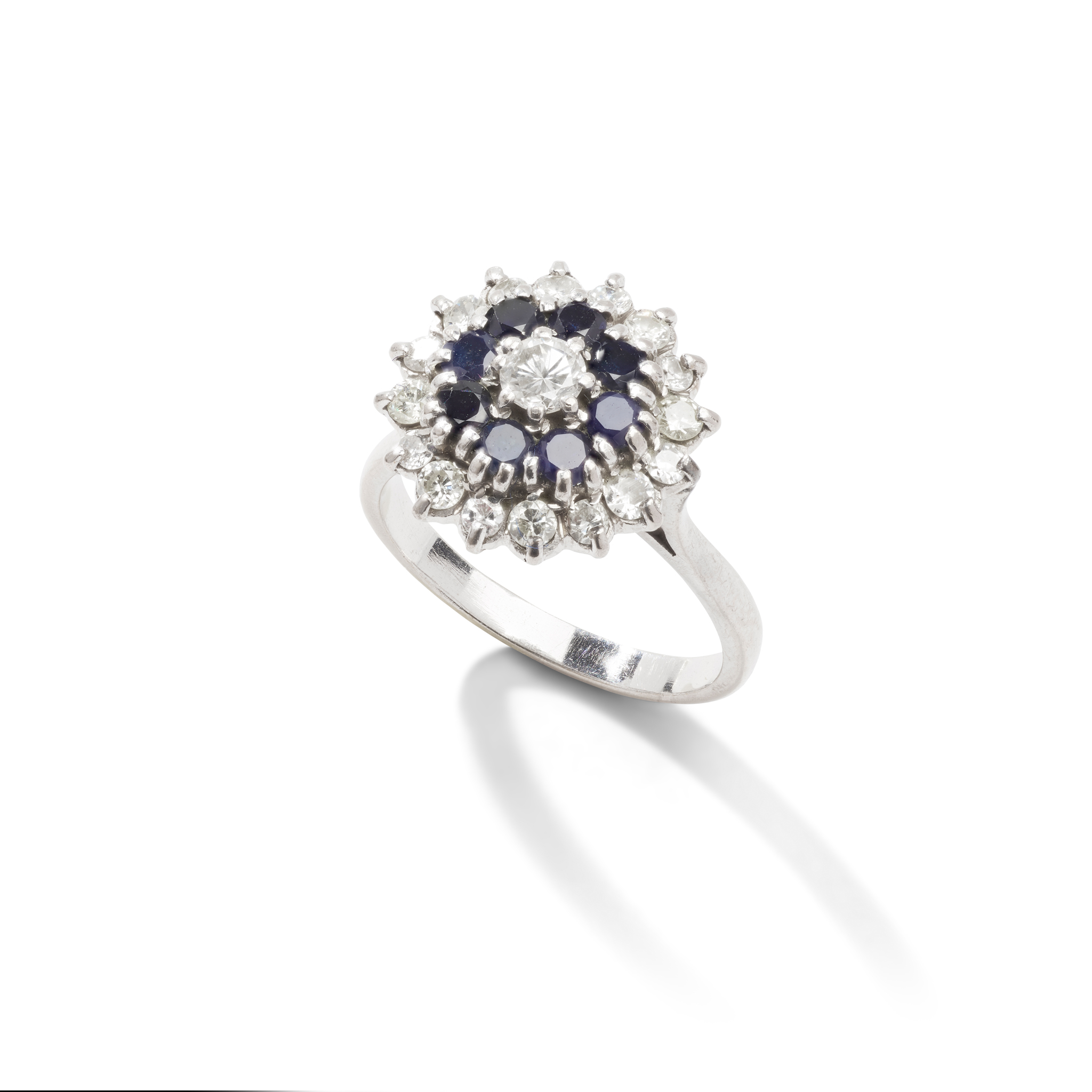 Claw-set with a round brilliant-cut diamond, in a double border of round brilliant-cut diamonds and sapphires, plain band, stamped 18ct