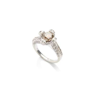 Claw-set with a round brilliant-cut fancy brown coloured diamond, weighing approximately 0.95cts, the twisted shoulders pavé-set throughout with colourless round brilliant-cut diamonds, stamped 14K