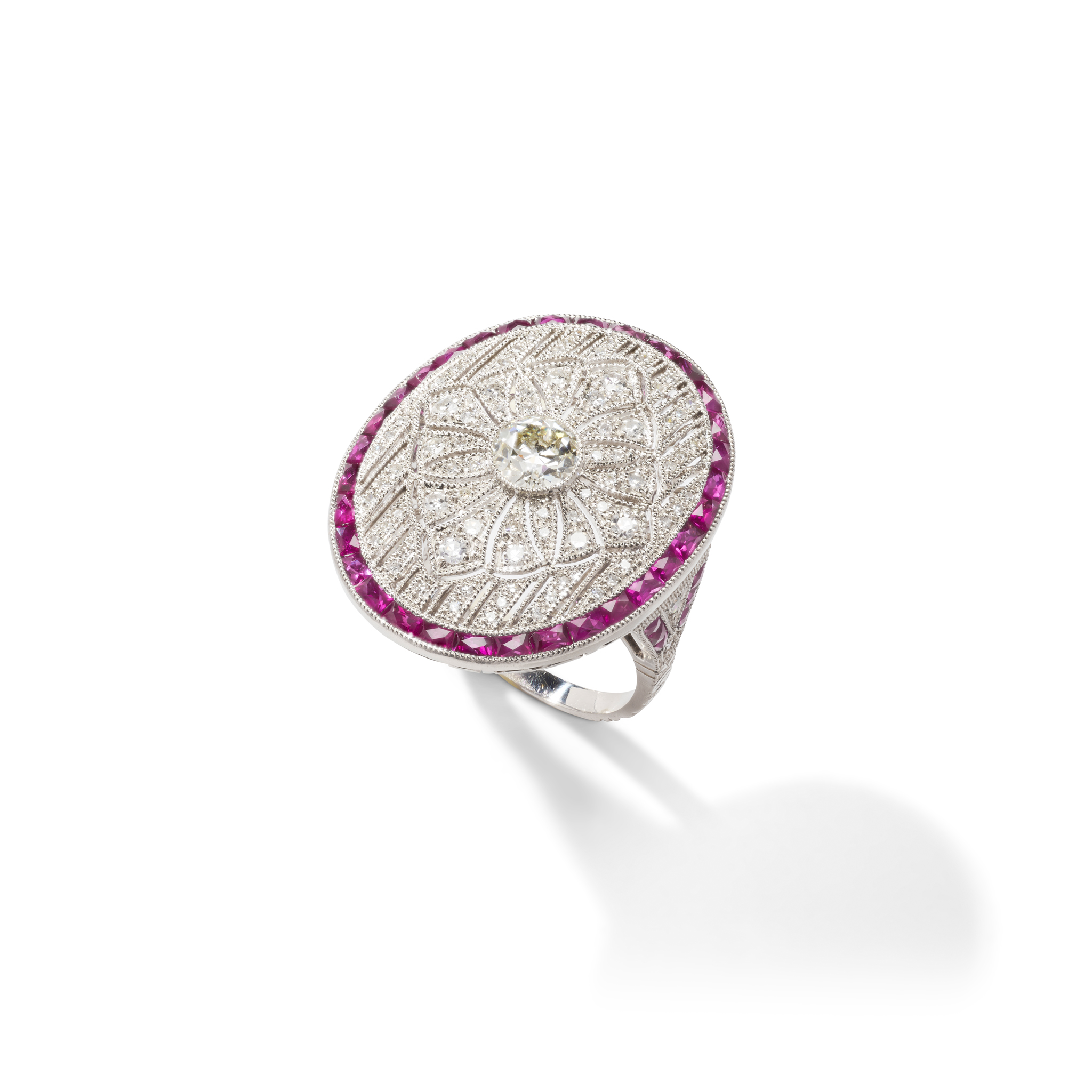 Collet-set with an old round-cut diamond, to a pierced oval plaque set with graduated eight-cut diamonds, in a border of calibré-cut rubies, ruby and diamond-set shoulders with engraved detail, plain band, stamped 850 PLAT