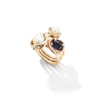 Including two freshwater cultured pearl examples, each in a stylised mount, to a plain band; and another oval-cut sapphire example of matching design, unmarked