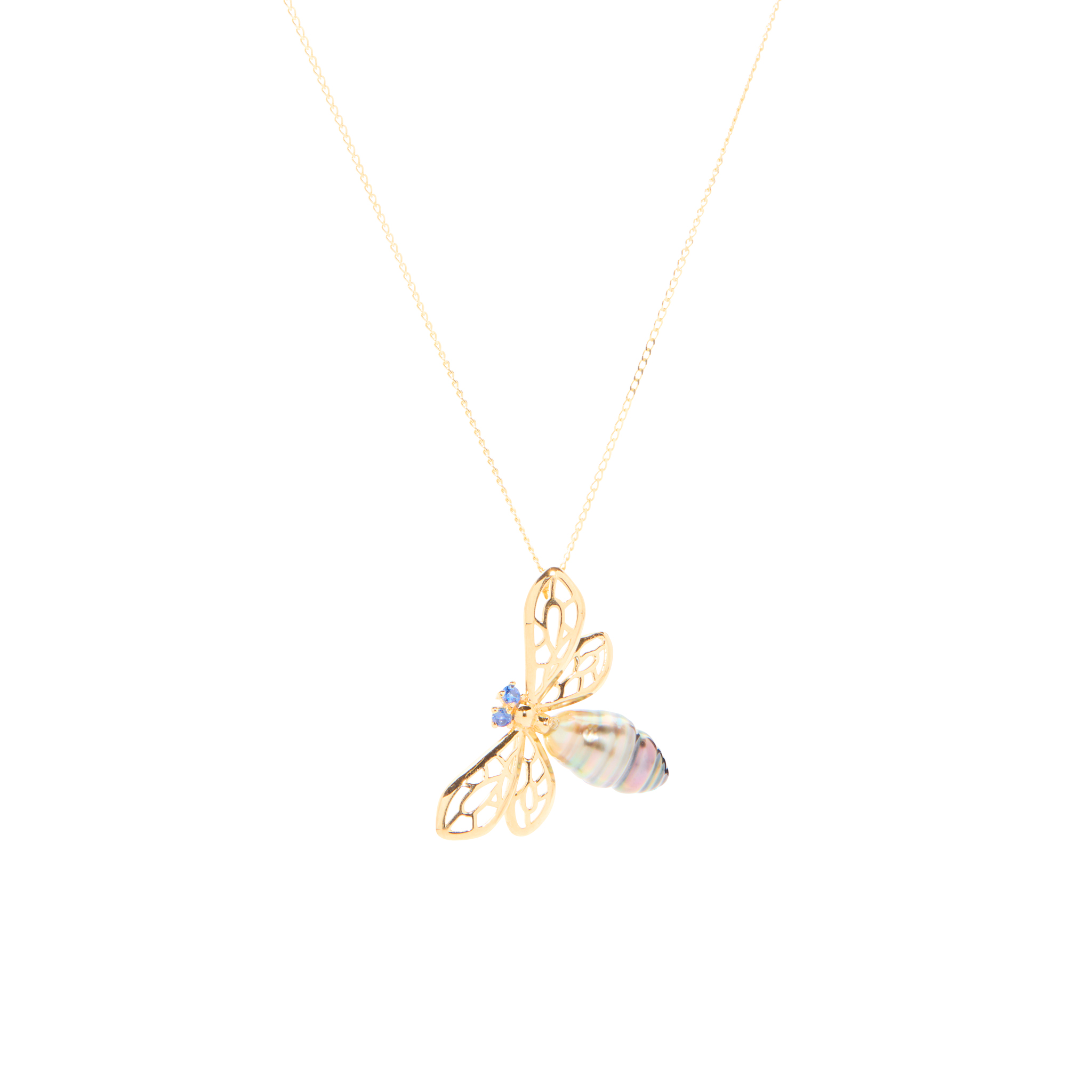 Depicting a stylised bee with an elongated Tahitian pearl body, round-cut sapphire eyes, trace-link chain, stamped 750
