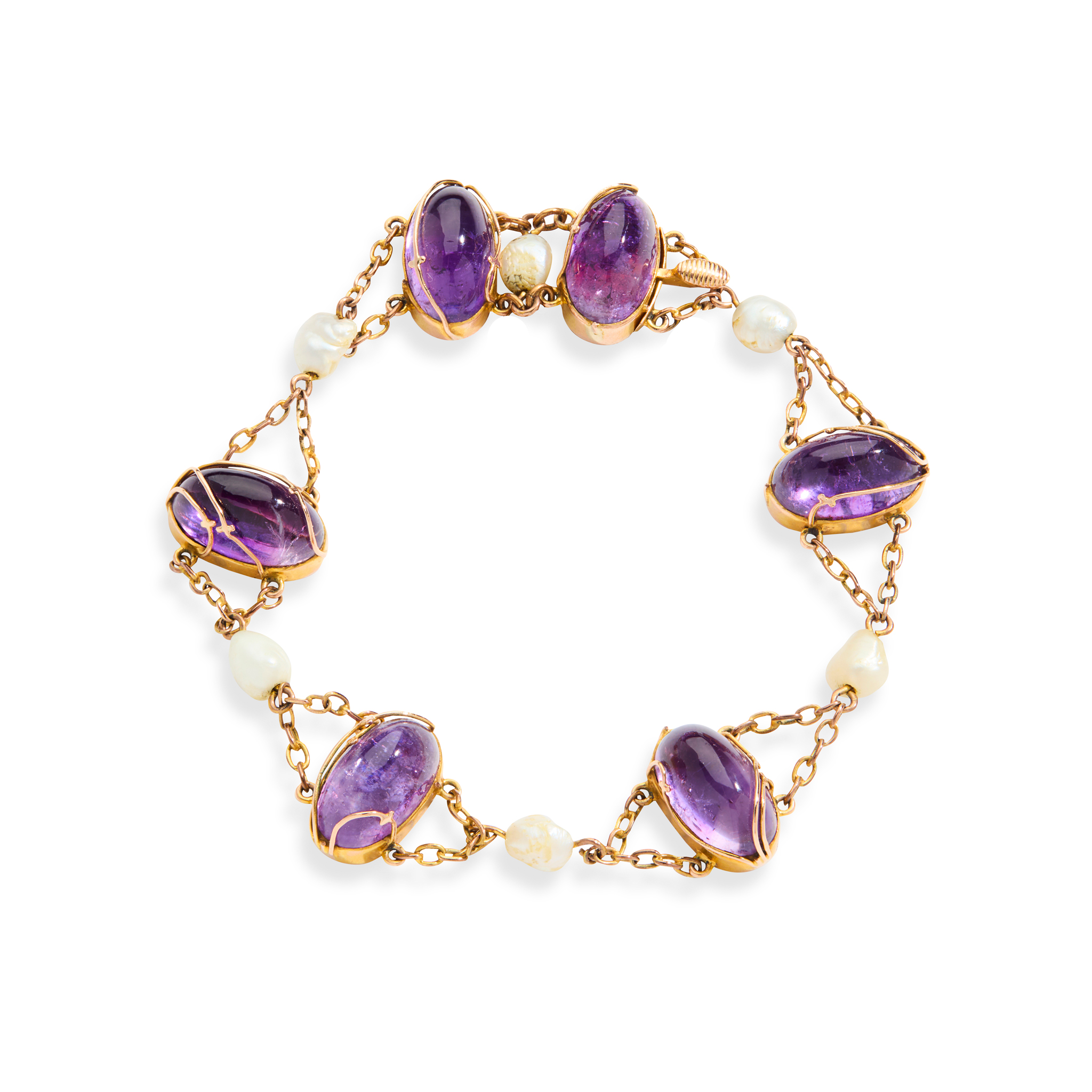 Collet-set with six cabochon amethysts, wire work detailing, between freshwater cultured pearls, trace-link chain, stamped 9ct