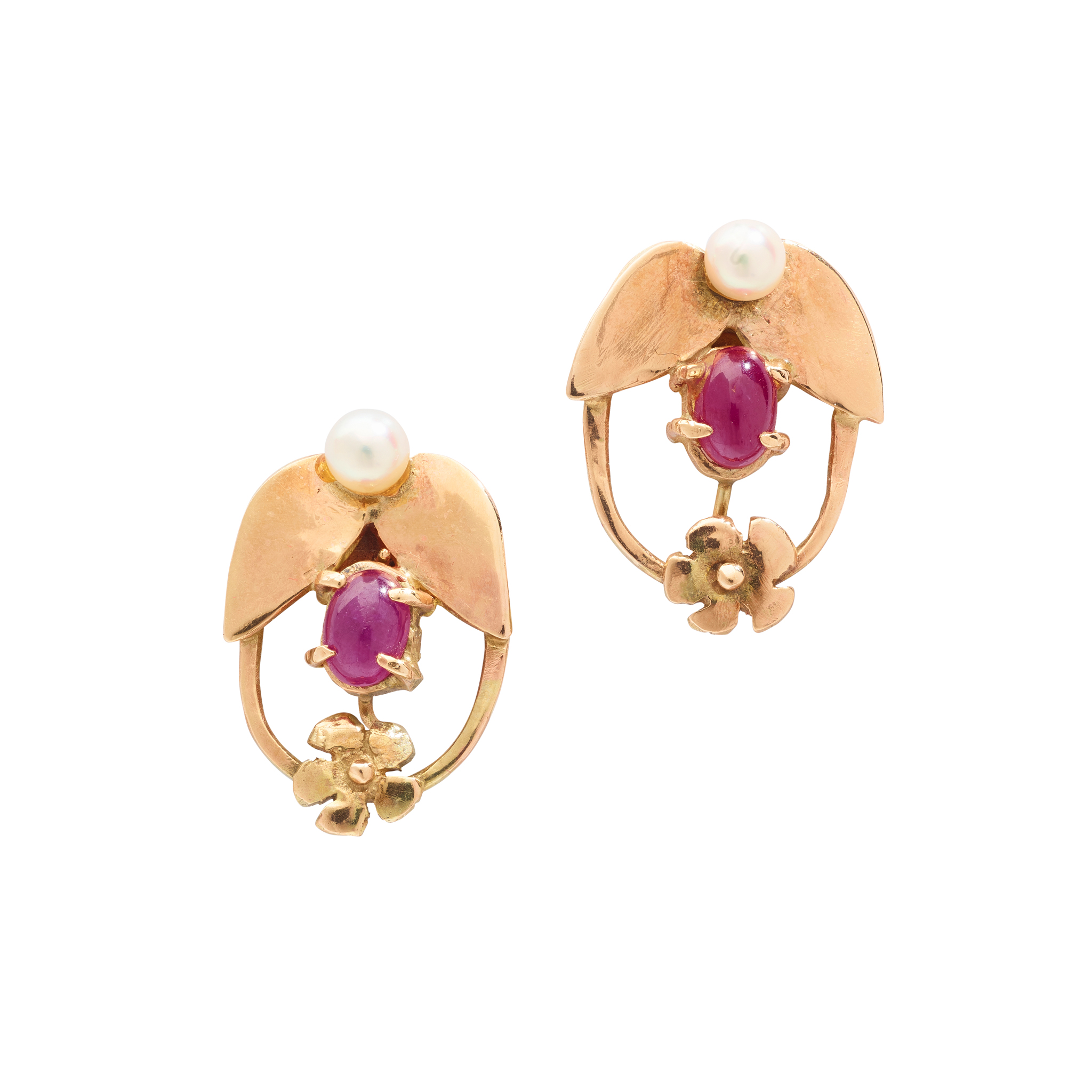Each claw-set with a cabochon ruby and a cultured pearl, floral detail, screw fittings, UK hallmark