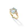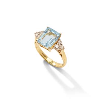 Claw-set with a rectangular step-cut aquamarine, a trio cluster of round brilliant-cut diamonds on either side, plain band, UK hallmark