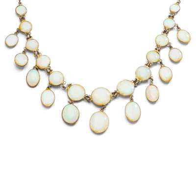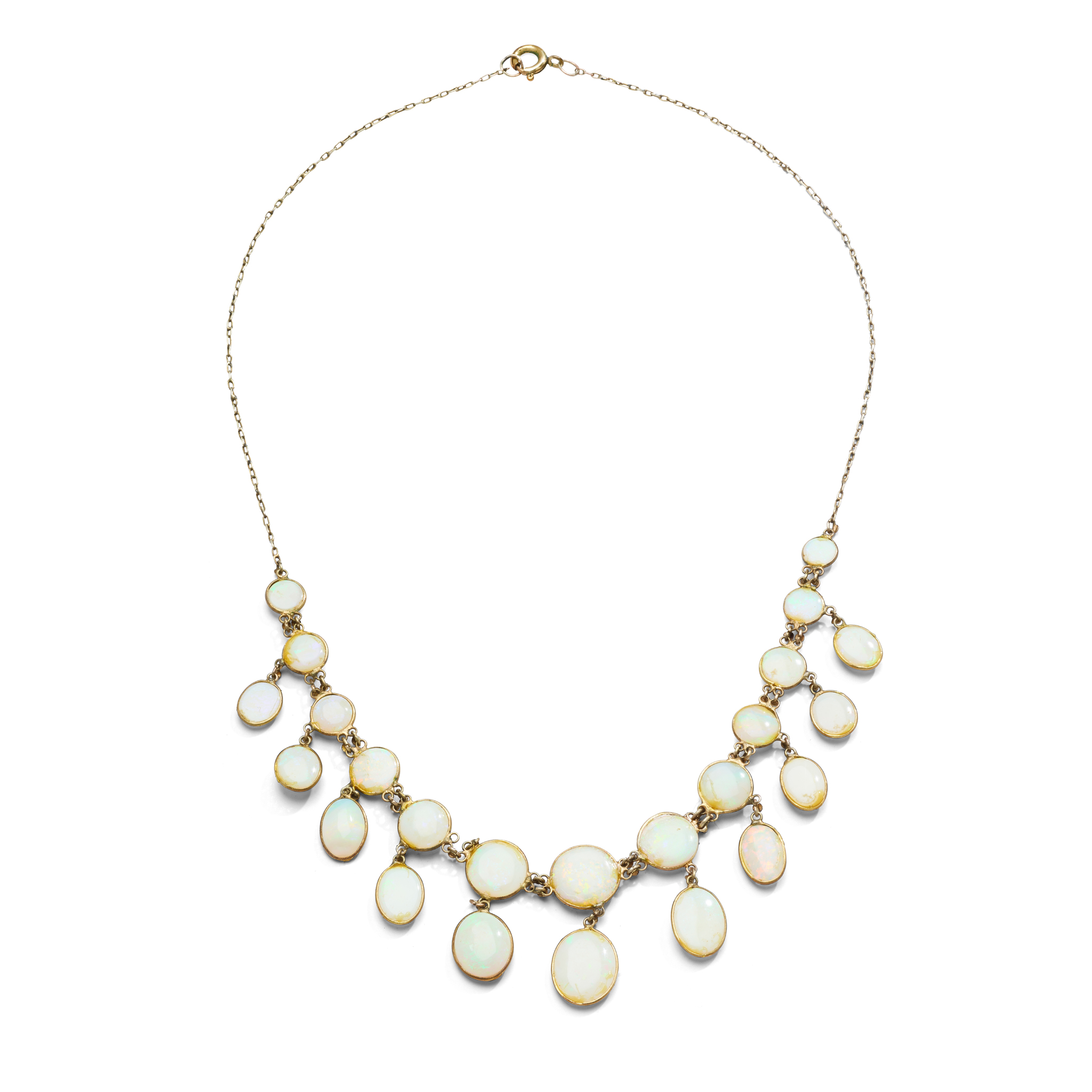 Spectacle-set with a combination of round and oval cabochon opals, trace-link chain, unmarked