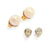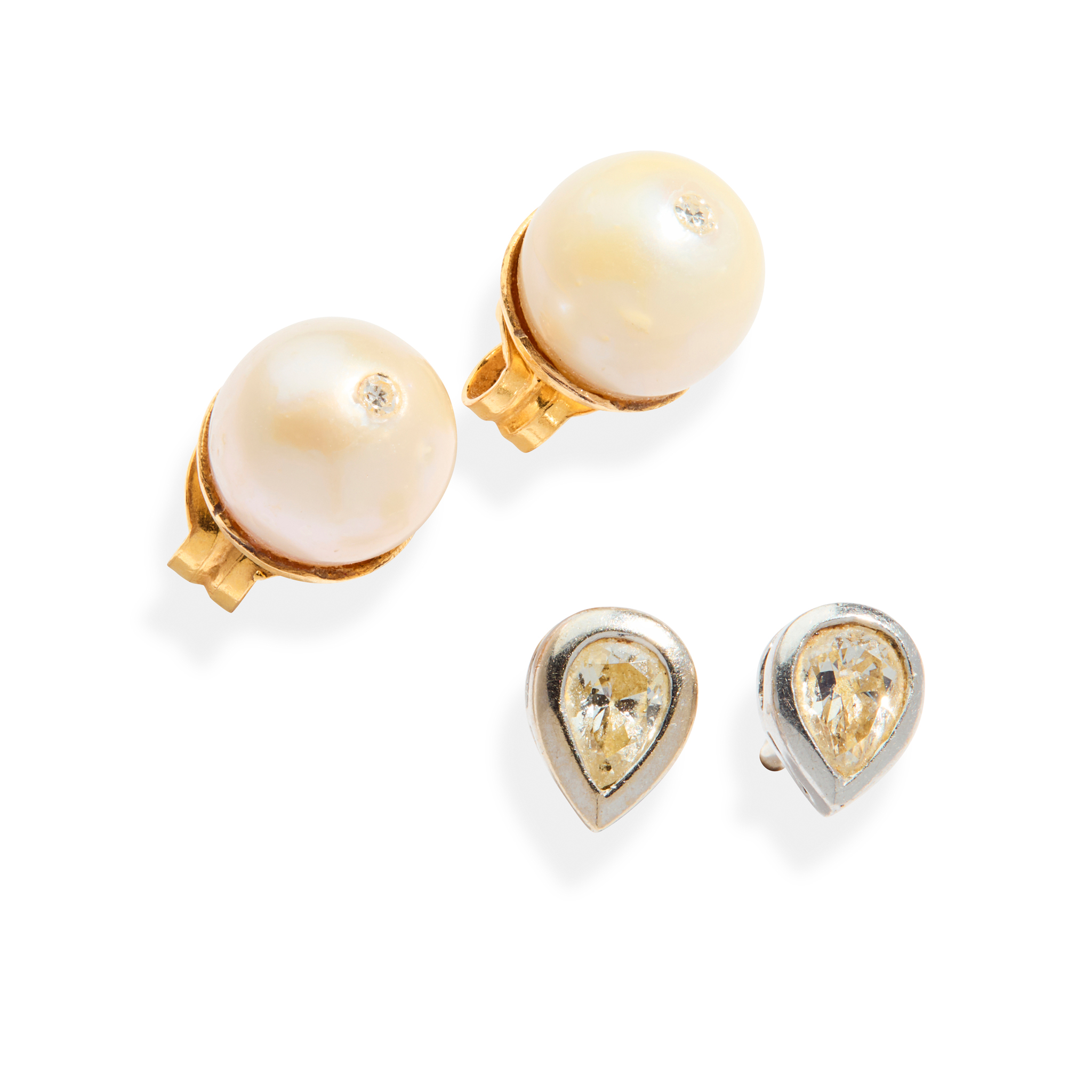 Each collet-set with a pear-shaped diamond, weighing approximately 0.20cts each, post and butterfly fittings, stamped 18k; together with a pair of 9ct gold pearl stud earrings, each with a small inset round-cut diamond, UK hallmark (2)