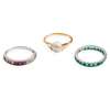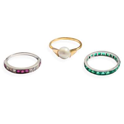 Including a ruby and diamond half-eternity ring, unmarked; an emerald eternity ring, unmarked; and a bouton pearl ring, unmarked (3)