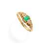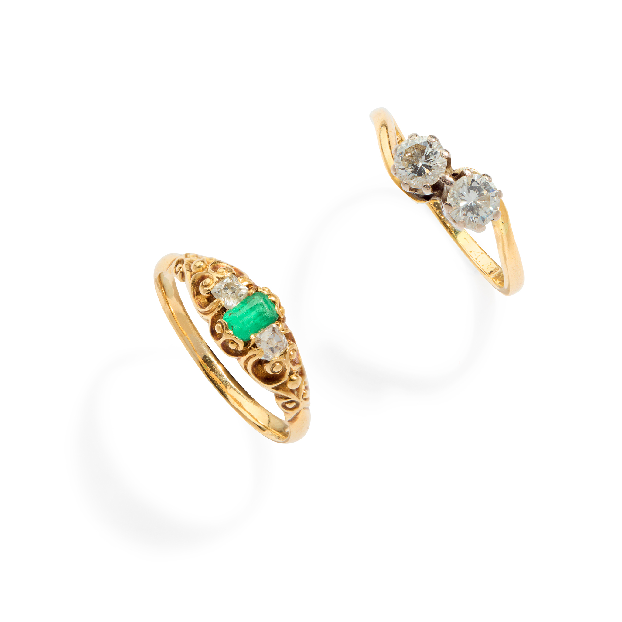 Claw-set with two round brilliant-cut diamonds, plain band, stamped 18ct; together with an emerald and diamond three-stone ring, claw-set with a rectangular step-cut emerald and two cushion-cut diamonds, scrolling details to shoulders, unmarked (2)