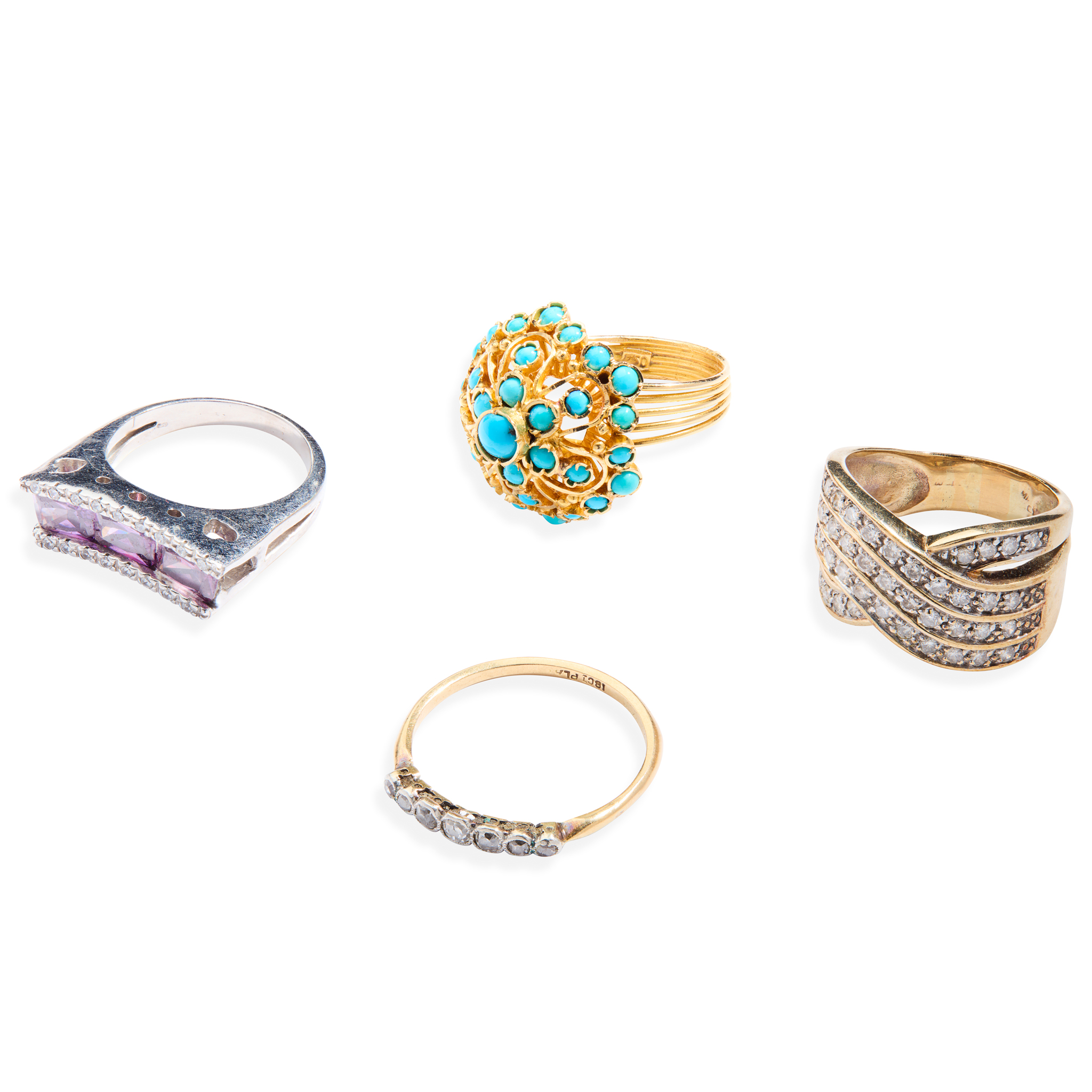 Including a large round brilliant-cut diamond dress ring, indistinctly marked; an amethyst and diamond dress ring, unmarked; a turquoise cluster ring, stamped 750, and seven stone diamond ring, stamped 18ct (4)