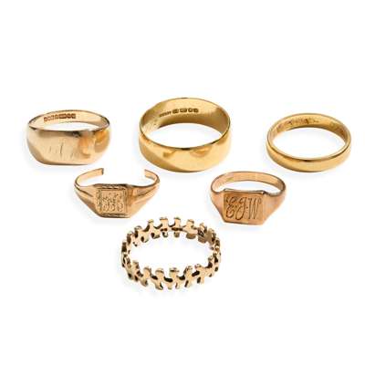 Including two 18ct gold wedding bands, three 9ct gold signet rings and a stylised 9ct gold wedding band, all with UK hallmarks (6)