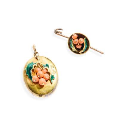 An enamel and coral pendant and matching brooch Y