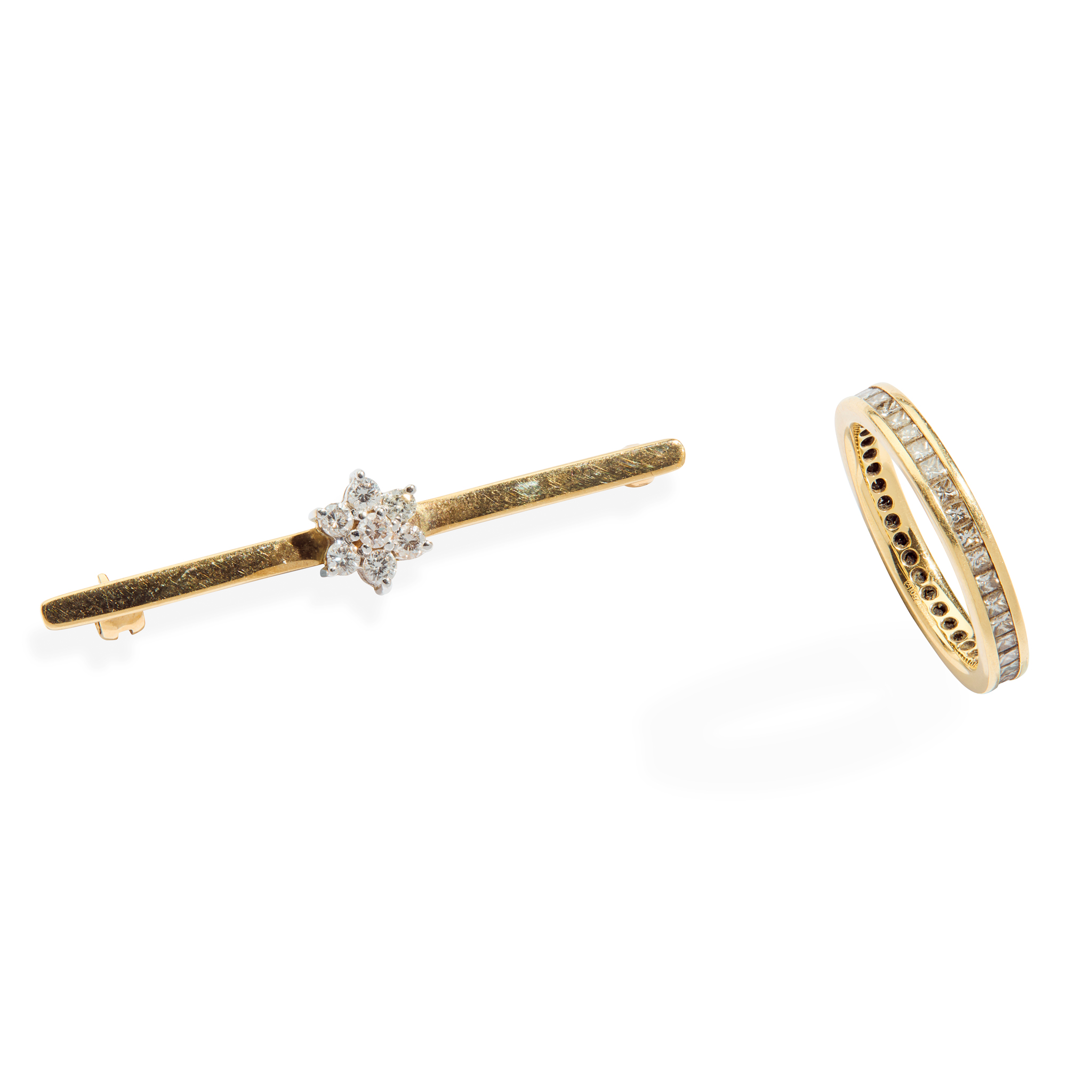 Channel-set with a continuous row of round brilliant-cut diamonds; together with a 9ct gold diamond cluster bar brooch, both with UK hallmark (2)