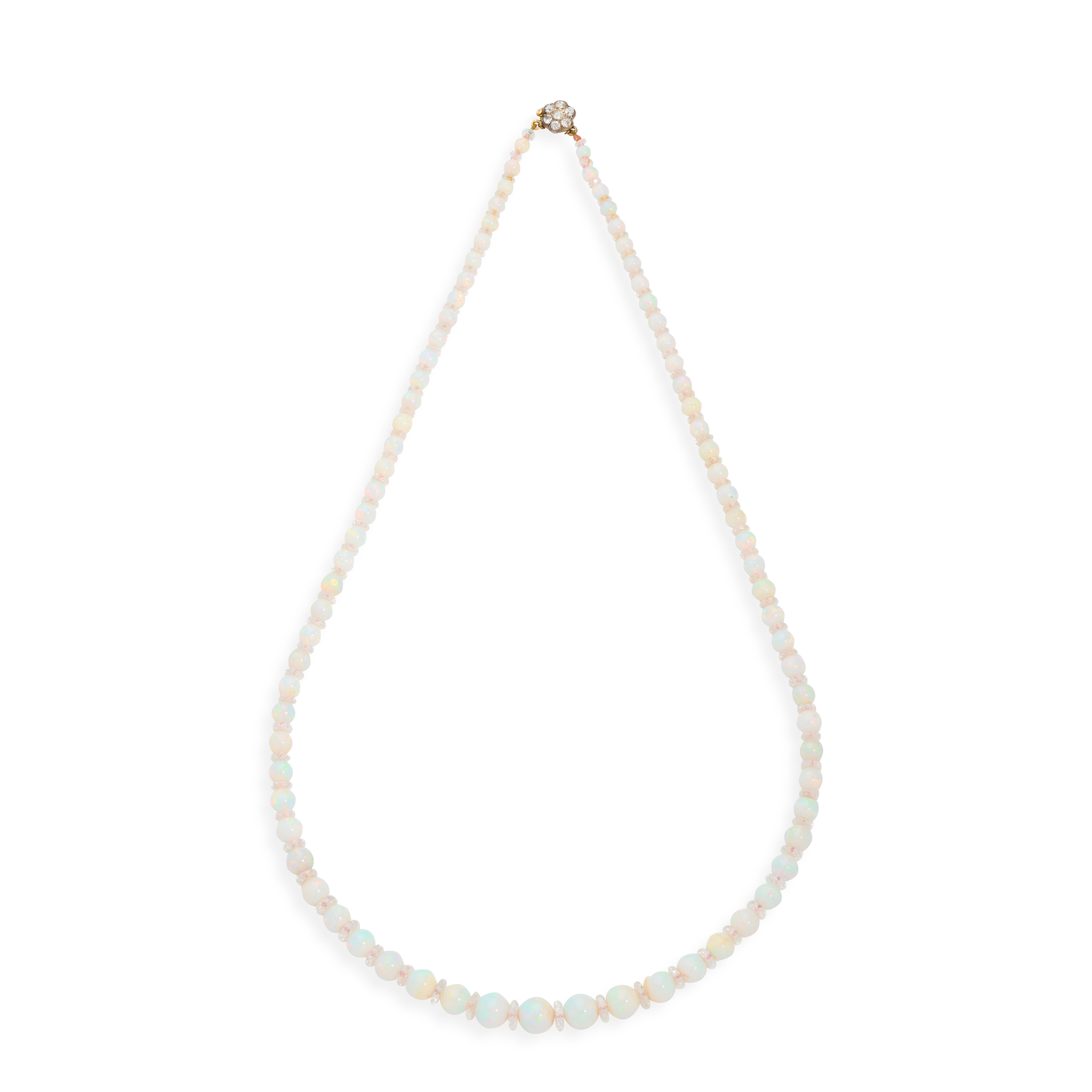 Composed of a single row of graduated opal beads and facetted rock crystal spacers, the floral clasp set with seven old round-cut diamonds, unmarked